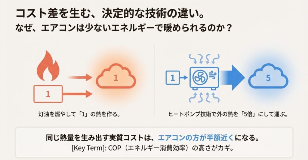 これが、私がお店で「ランニングコストならエアコンですよ」と断言できる最大の理由なんです。