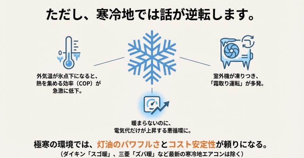こういう過酷な環境だと、エアコンの実質コストが跳ね上がって、灯油ストーブの方が安くなる、あるいは「安さ以前にエアコンじゃ話にならない」という逆転現象が起きます。