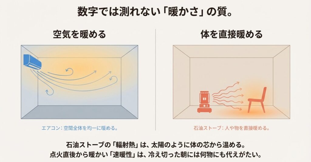 これなら、エアコンの「立ち上がりが遅い」という弱点と、ストーブの「燃費が悪い・空気が汚れる」という弱点を、お互いにカバーし合えるんです。