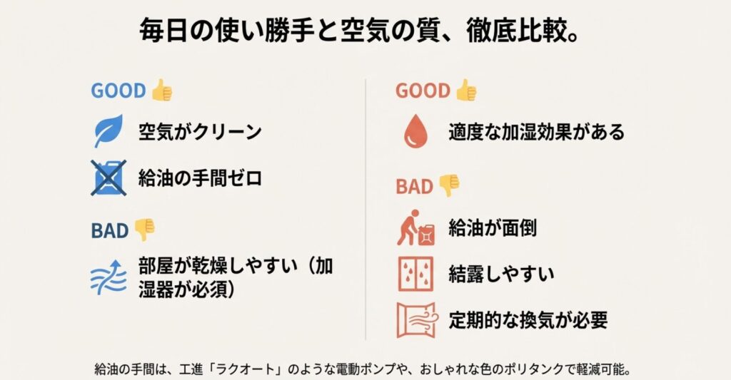「安いのはわかったけど、寒いのを我慢するのは嫌!」とか「灯油入れるの面倒くさすぎ!」とか、そういう毎日のストレスや快適さも、コストと同じくらい大事な判断基準です。