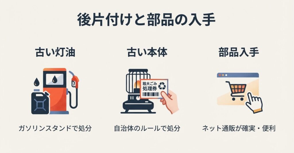 そして、もしストーブ本体を買い替えて処分する場合は、多くの自治体で「粗大ごみ」扱いになります。灯油を完全に抜いて、乾電池も外してから出しましょう。