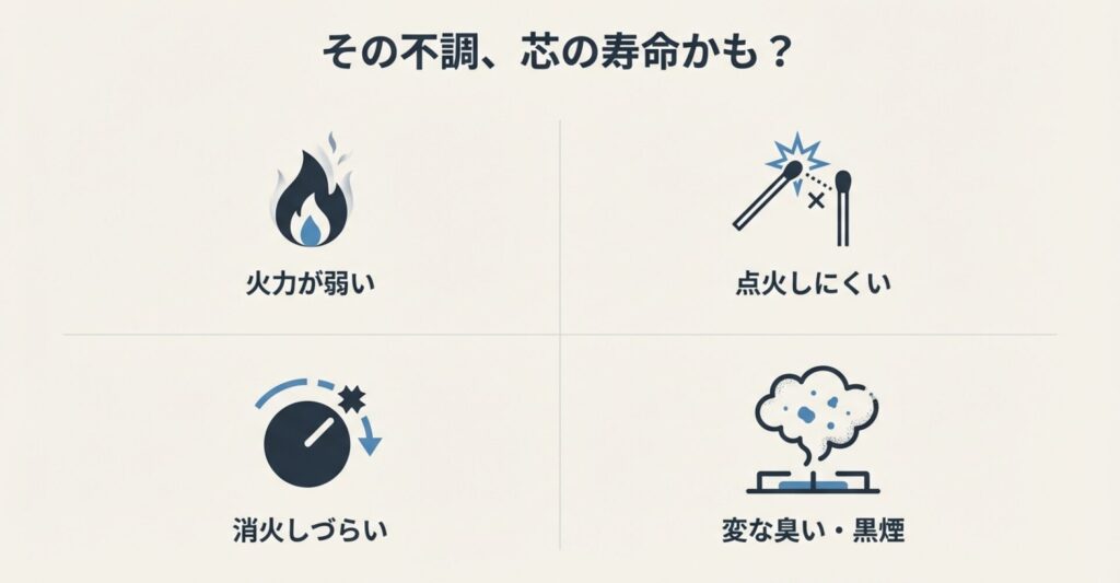 芯の状態は外からパッと見ただけでは分かりにくいですが、ストーブが出している「SOSサイン」を見逃さないことが大切です。