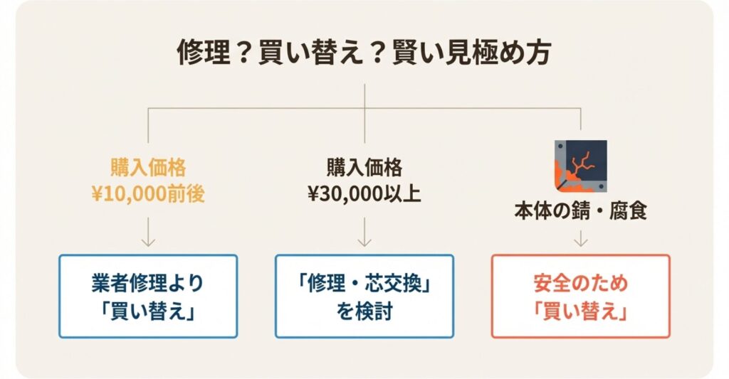 さらに、修理すべきか買い替えるべきかの判断基準や、初心者の方でも失敗しないための交換手順、長持ちさせるコツまでたっぷりお話しします。