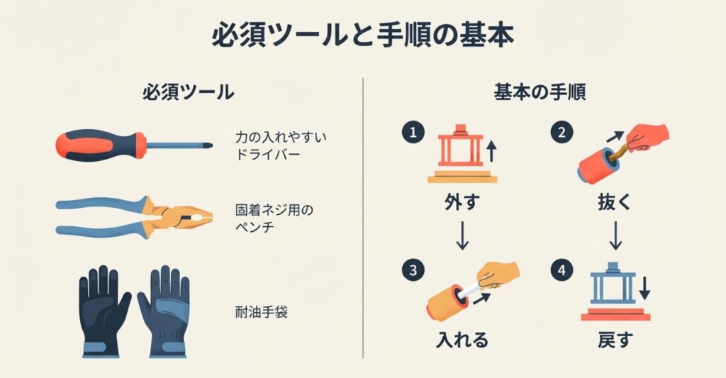 でも大丈夫、石油ストーブの構造は意外とアナログでシンプルなんです。基本的には「外して、替えて、戻す」の3ステップ。