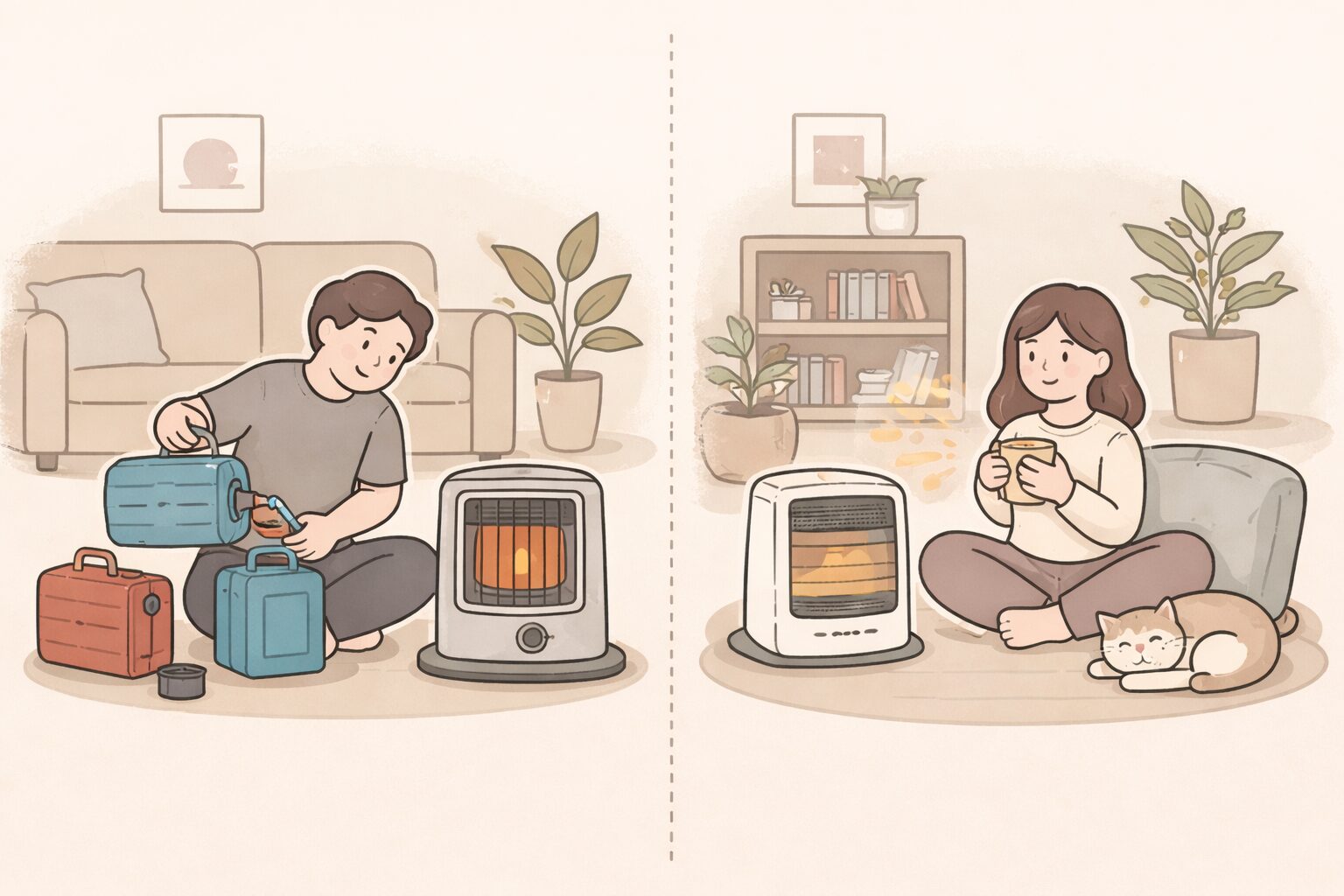 より具体的に「灯油代+電気代」まで含めて比較したい方は、石油ストーブと石油ファンヒーターの燃費を比較!電気代含めた総コストも合わせて確認してみてください。