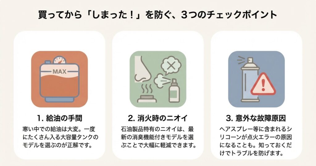 また、給油口のキャップが手をごさずに開けられる工夫がされているか(コロナの「よごれま栓」など)も、毎日のことなのでチェック必須ですよ。