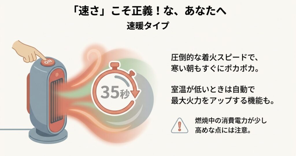 他社が1分以上かかることもある中で、この早さは魔法みたいですよ。寒い朝に布団から出て、すぐにお部屋がポカポカになる幸せは、一度味わうと戻れません。