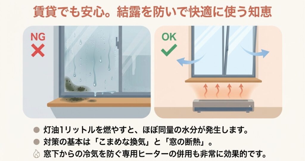 石油暖房が禁止されている物件も多いですが、その大きな理由の一つが「結露」なんです。