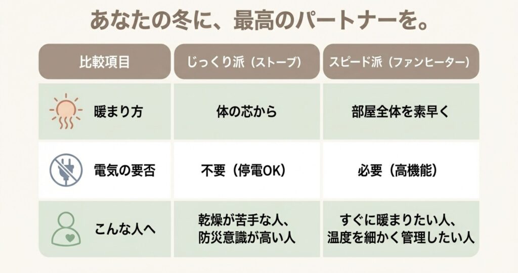 さて、ここまで石油ストーブとファンヒーターの違いについて、いろいろお話ししてきましたが、最後におさらいをしておきましょう。