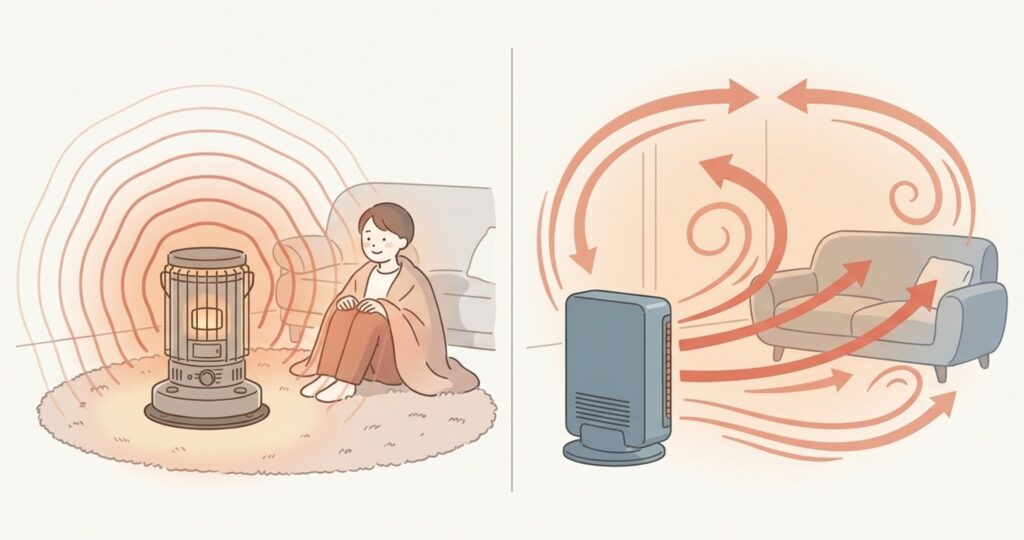 石油ストーブは、太陽の光と同じような遠赤外線による「輻射熱」がメイン。ストーブの近くにいると、空気そのものはそれほど熱くなくても、肌が直接ジリジリと暖まるのを感じますよね。