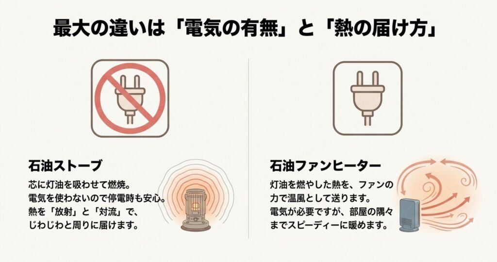 まず、一番大きな違いは「電気を使うかどうか」と「熱の届け方」なんです。