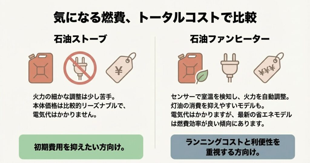 灯油代だけで考えると、最新の省エネ機能を備えたファンヒーターの方が、トータルでの燃費効率は良い傾向にあるかもしれません。