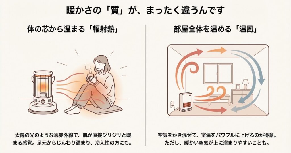 対してファンヒーターは、灯油を燃やした熱をファンの力で温風として送り出す仕組みです。