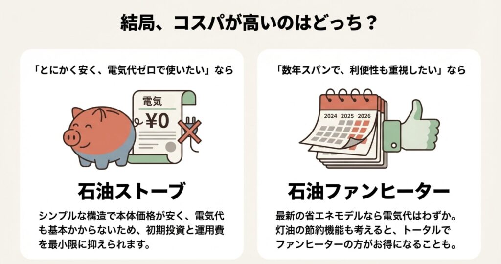 コスパを考えるとき、ついつい灯油代だけを見がちですが、実は初期費用や電気代、メンテナンス性も含めたトータルバランスが重要なんです。