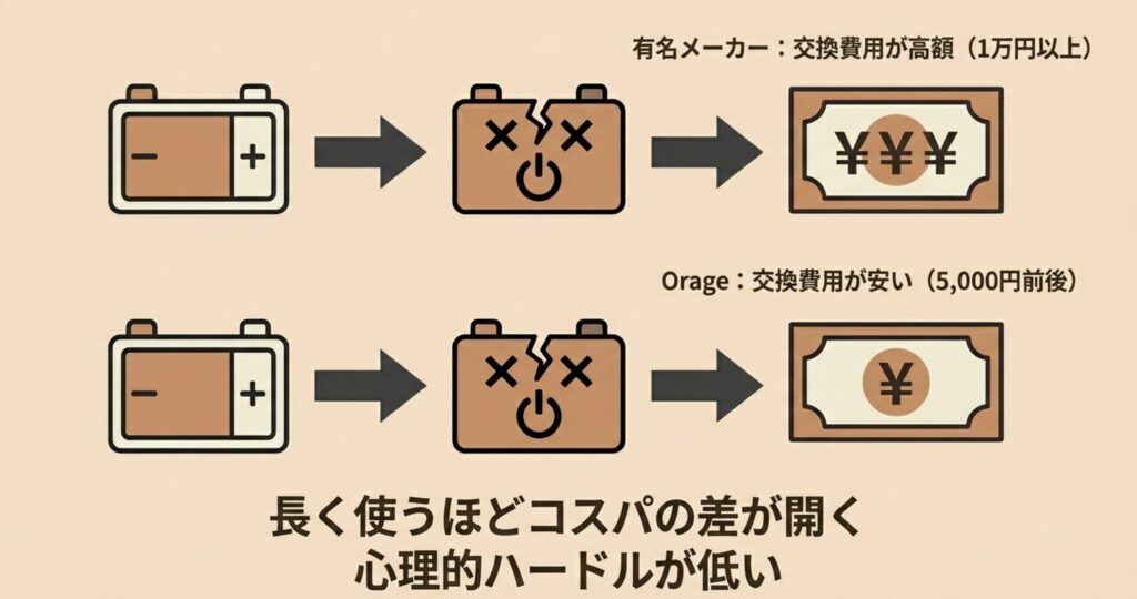 大手メーカーだとバッテリー1個で1万円以上することも珍しくありませんが、オラージュなら数千円で購入できることが多いので、お財布へのダメージが少ないのが嬉しいですよね。