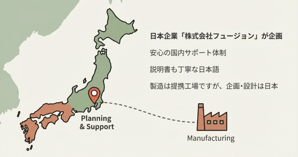 実はこれ、「フュージョンマーケティング株式会社」という日本の会社が展開しているブランドなんです。所在地は大阪府大阪市にあって、企画やデザイン、アフターサポートなどはすべて日本国内で行われています。