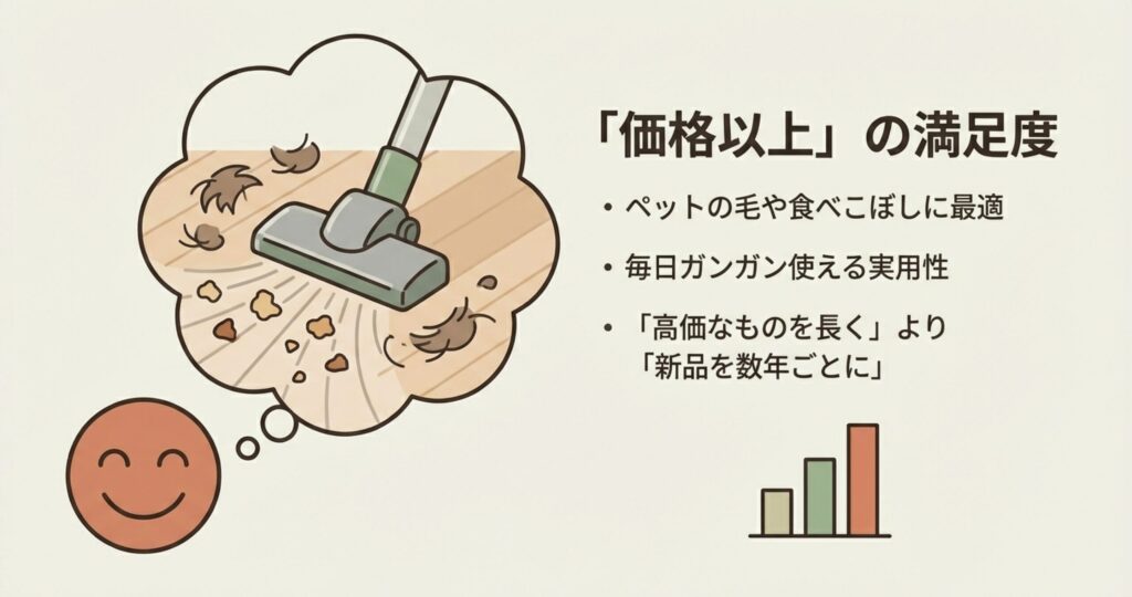 私が直接お話ししたお客様からは、「ダイソンを使っていたけれど、この価格で十分だと思った」という声や、「軽くて小回りが利くから、掃除の回数が増えた」なんて感想をよくいただきます。特にお子さんの食べこぼしや、ペットの毛をサッと掃除したいご家庭での評判がすこぶる良いですね。