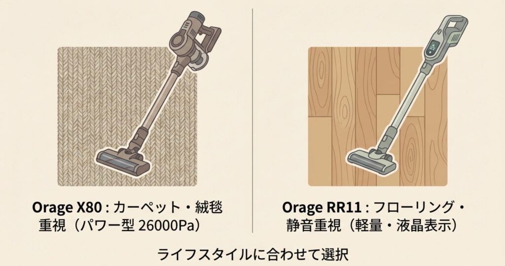 オラージュの中でも特に人気を二分しているのが、「Orage X80」と「Orage RR11」です。「どっちが買い?」と聞かれたら、私はあなたの「掃除のスタイル」で選ぶことをおすすめします。