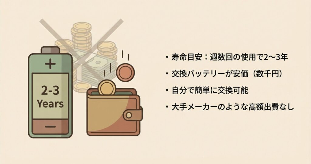 交換用バッテリーが5000円前後で手に入ることが多いので、数年後にパワーが落ちてきたときの心理的ハードルが圧倒的に低い。掃除機は毎日使うものだから、メンテナンスコストを抑えられるのは、長く付き合っていく上で大きな安心材料になりますよね。