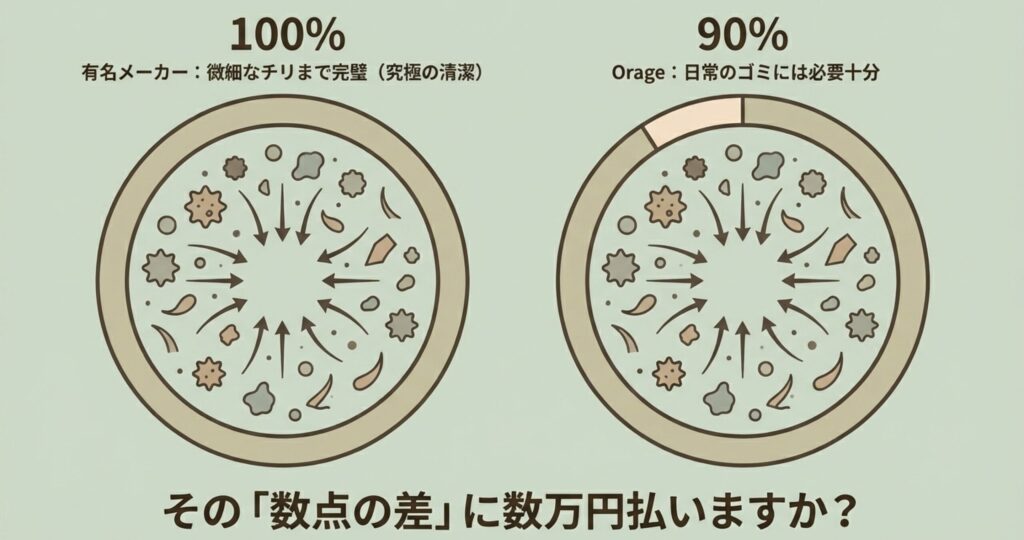 正直なところ、ダイソンで100点取れる掃除が、オラージュなら85点〜90点くらいでできる、というイメージ。その「数点の差」に、数万円の価格差を払うかどうかが分かれ道になります。