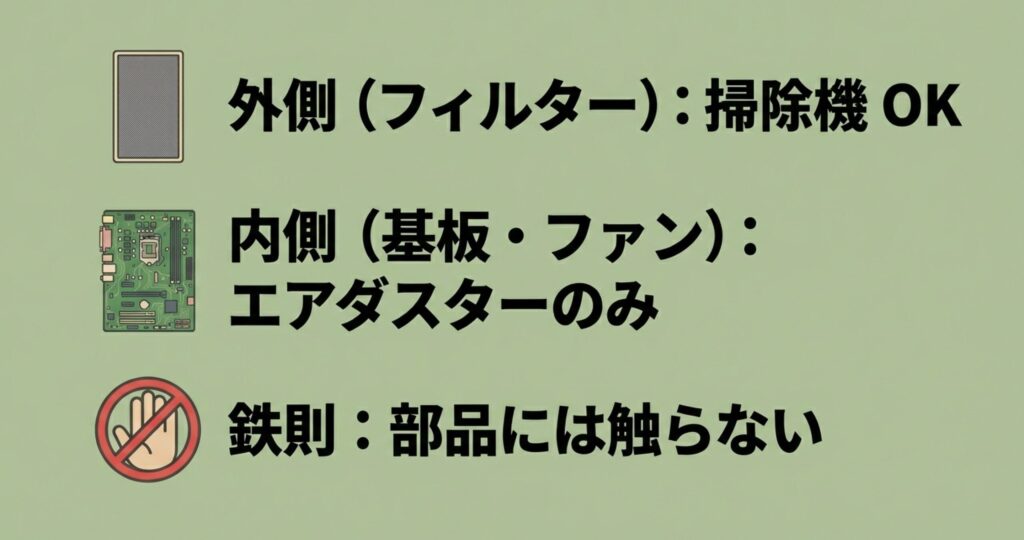 | 掃除機の使用 | ケース外側、フィルター、周辺の床 | 基板、コネクタ、メモリへの直接吸引 |