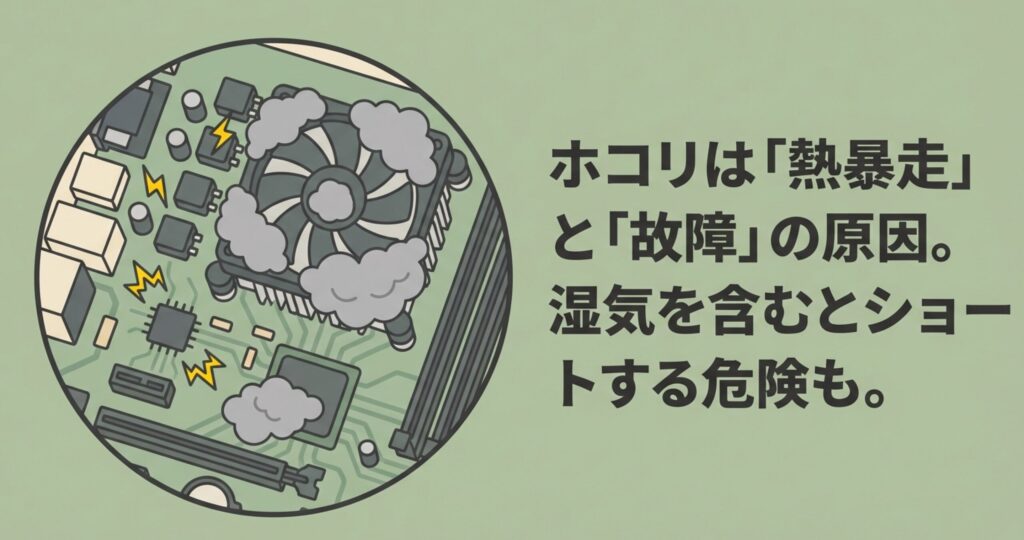 ホコリ自体は乾燥していれば電気を通しにくいですが、お部屋の湿気やキッチンの油分と混ざり合うと、基板の上で微弱な電流を流してしまうことがあるんです。これがショートやトラッキング現象の原因になり、パソコンが二度と動かなくなる致命的な故障を招くこともあります。