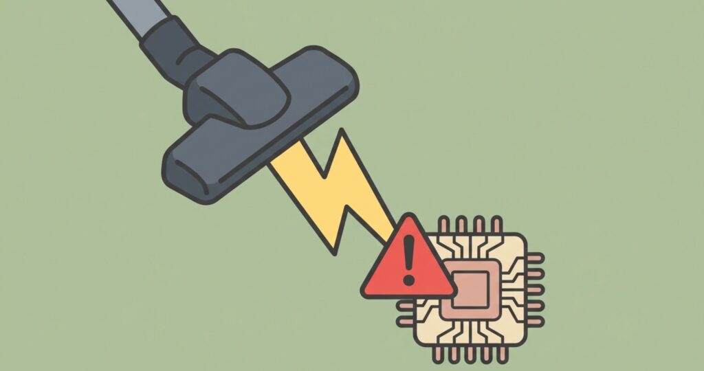 掃除機のノズルはプラスチック製のものが多く、高速で空気が通り過ぎる際に強力な摩擦静電気が発生します。このノズルをデリケートな電子部品が並ぶ基板に近づけると、パチンと放電が起き、一瞬で回路を焼き切ってしまうことがあるんです。