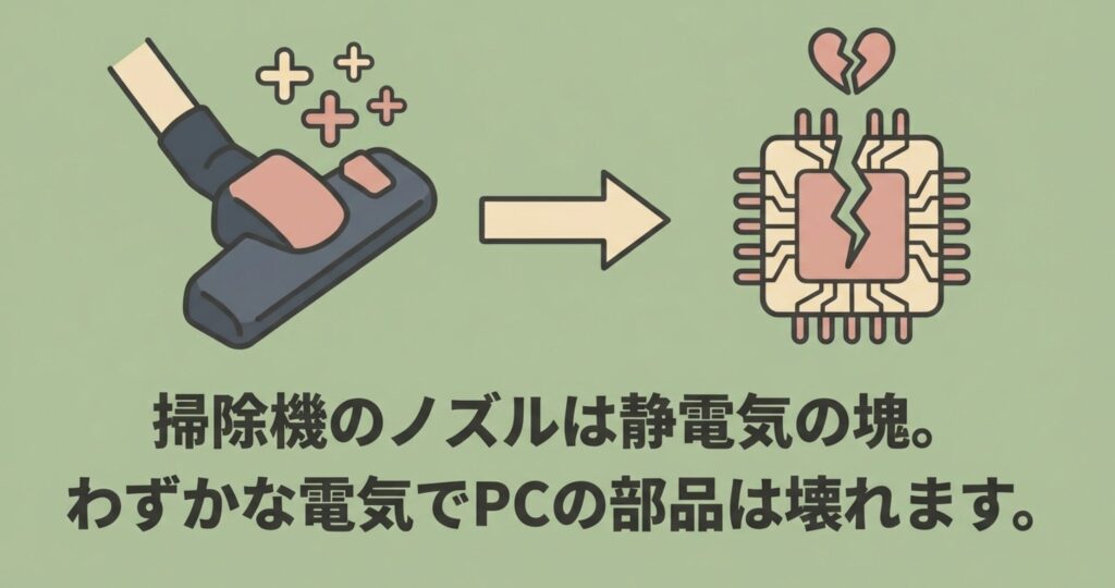 パソコンの内部に溜まったホコリを掃除機で吸い出すことには、実は見えない危険が潜んでいます。