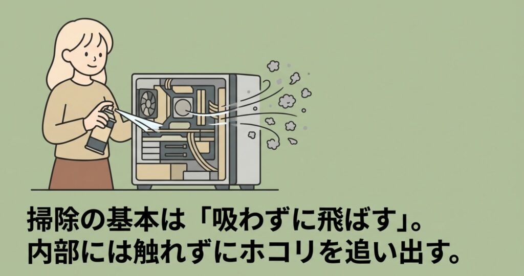 パソコン掃除の基本は、とにかく「吸う」のではなく「吹き飛ばす」ことです。これを陽圧清掃と呼びますが、内部に触れずにホコリを外へ追い出すのが最も安全な方法なんですよ。