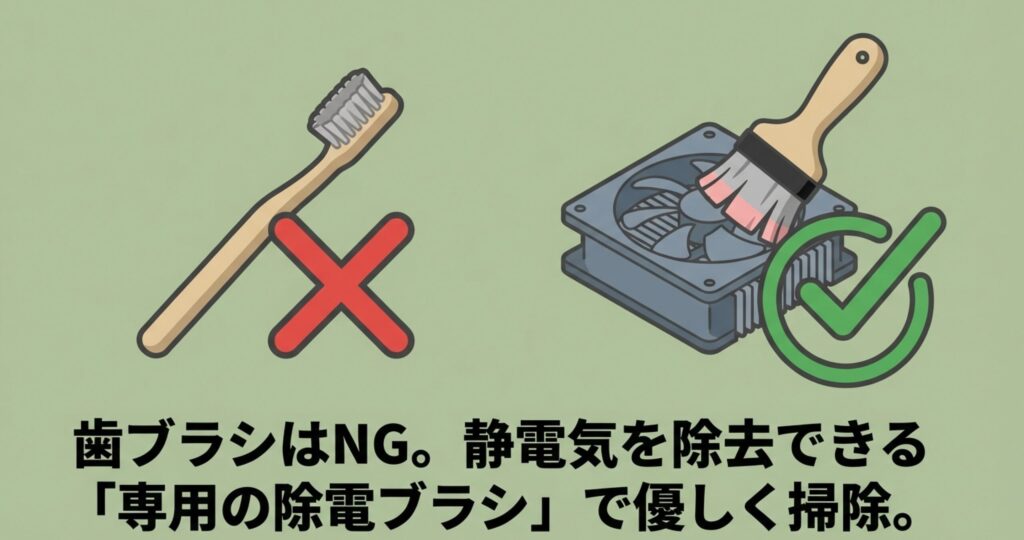 でも、おうちにある古くなった歯ブラシを使うのはやめてくださいね。毛が硬すぎて基板を傷つけたり、逆に静電気を発生させたりしちゃうからです。
