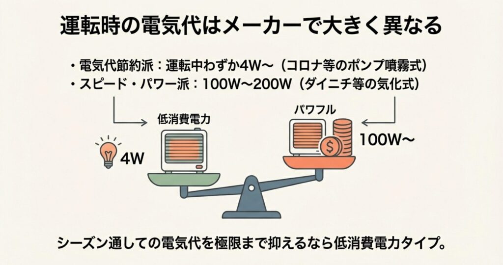 ダイニチは灯油をガス化するために電気ヒーターを使う気化式なので、運転中の電気代が少し高め。モデルにもよりますが、大火力時は100W〜200W近く使うこともあります。