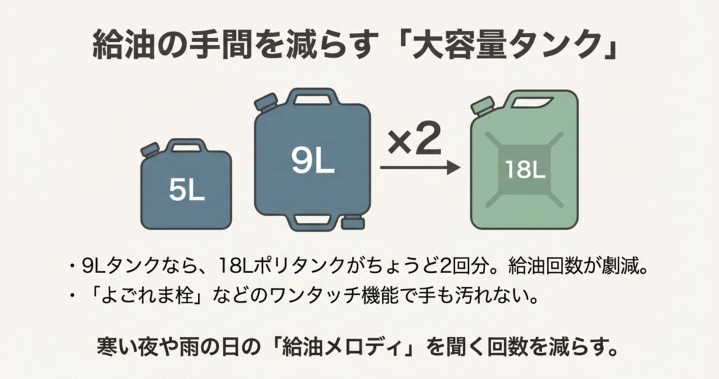 「給油回数を減らしたいか、給油の作業自体を楽にしたいか」という視点で選ぶと、家事が少しだけ楽になりますよ。18リットルのポリタンクをちょうど2回で使い切れる9リットルタンクは、管理もしやすくて本当におすすめです!