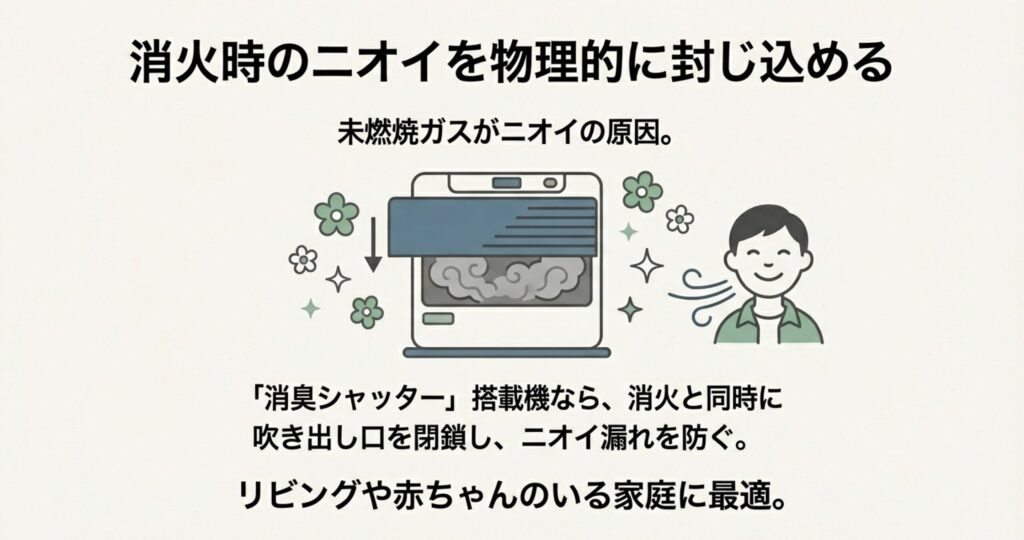 たとえばコロナのWZシリーズには消臭シャッターがついていて、消火と同時に吹き出し口を物理的に閉じて、ニオイが漏れるのを防いでくれるんです。