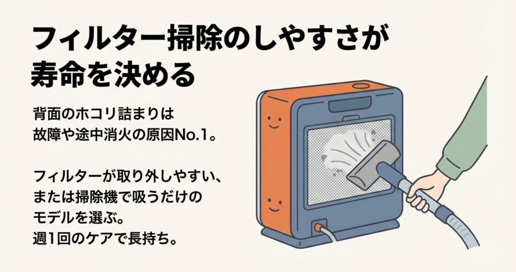 「お掃除が面倒」と感じる人ほど、メンテナンス性が高いシンプルな構造の機種を選んでほしいなと思います。フィルターを綺麗に保つだけで燃費も良くなりますし、何より安全に使えますからね。