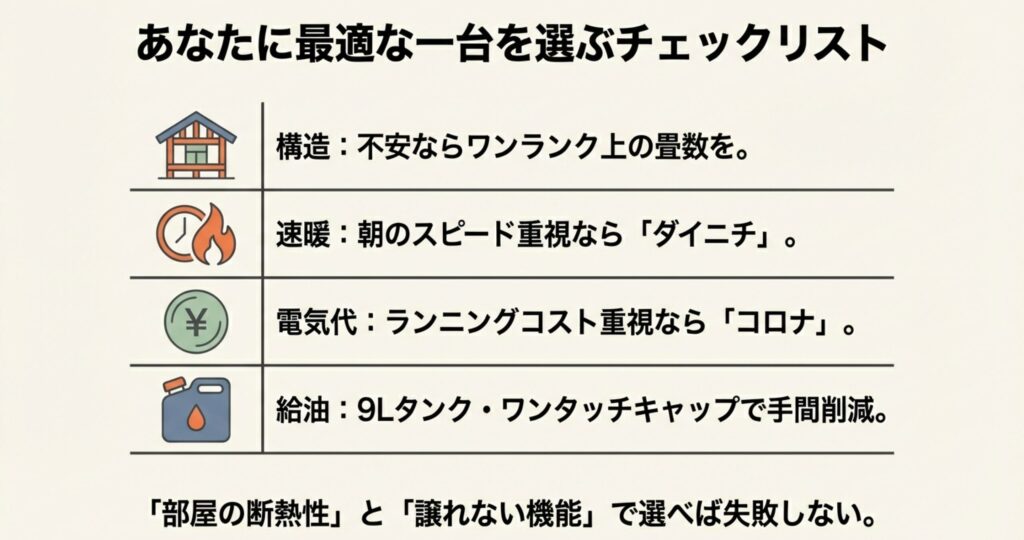 とにかく最速を狙うならコロナ、設定の手間なく手軽に早く暖まりたいならダイニチを選ぶのが、後悔しないコツですよ。どちらも朝の強い味方になってくれることは間違いありません!