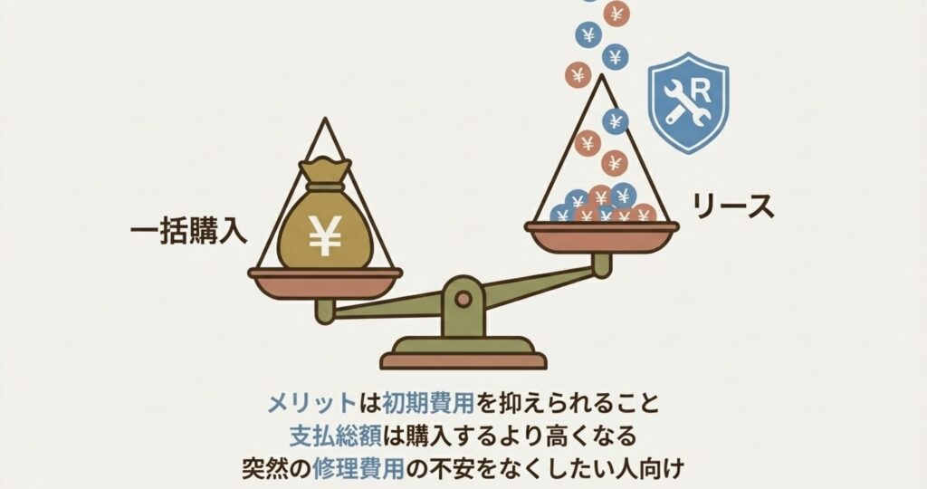 リースの最大のメリットは、故障時の修理費用が無料になることが多い点ですね。10年間の安心を買う、という考え方ならアリかもしれません。