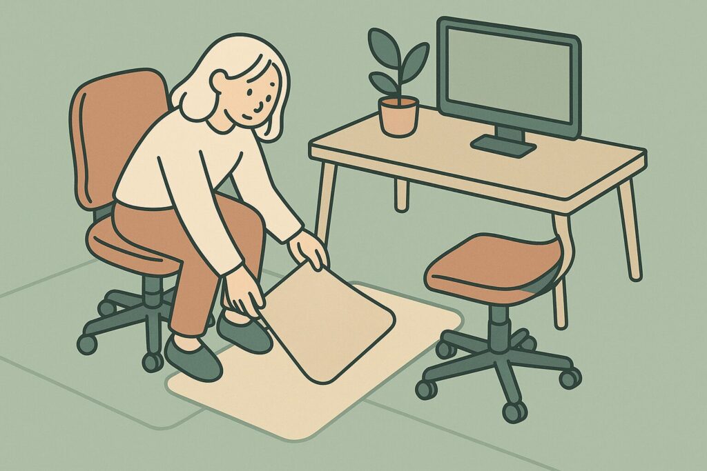 デスク周りのスペースに合わせて、160×140cmのような大判サイズや、市販されている幅広のマットを選ぶと、椅子の移動範囲をしっかりカバーできて安心ですよ。