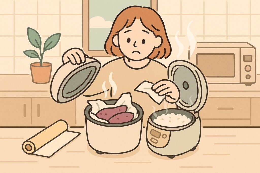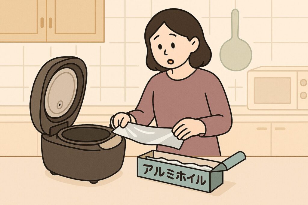 SNSなどで「アルミホイルで包んで蒸し芋を…」といったレシピを見かけることがありますが、アルミホイルもラップも、炊飯器での使用は絶対にNGです。