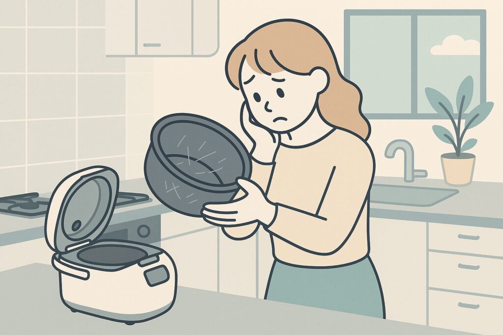 それだけではなく、剥がれた部分と残っている部分で熱の伝わり方が不均一になり、炊きムラができたり、そこだけ焦げ付きやすくなったりします。ご飯の風味が落ちる可能性は十分に考えられます。