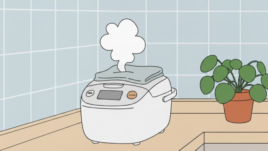 湿ったままにしておくと、そこからカビが発生してしまい、かえって不衛生になってしまう可能性があります。炊飯が終わったら、こまめに乾いたタオルと交換するか、しっかりと乾かすようにしてくださいね。