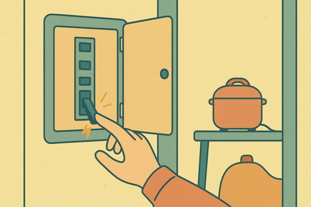 この瞬間、安全ブレーカーが「電気が使われすぎです!危険です!」と判断し、自動的にキッチンの電気を遮断します。これが「ブレーカーが落ちる」正体です。