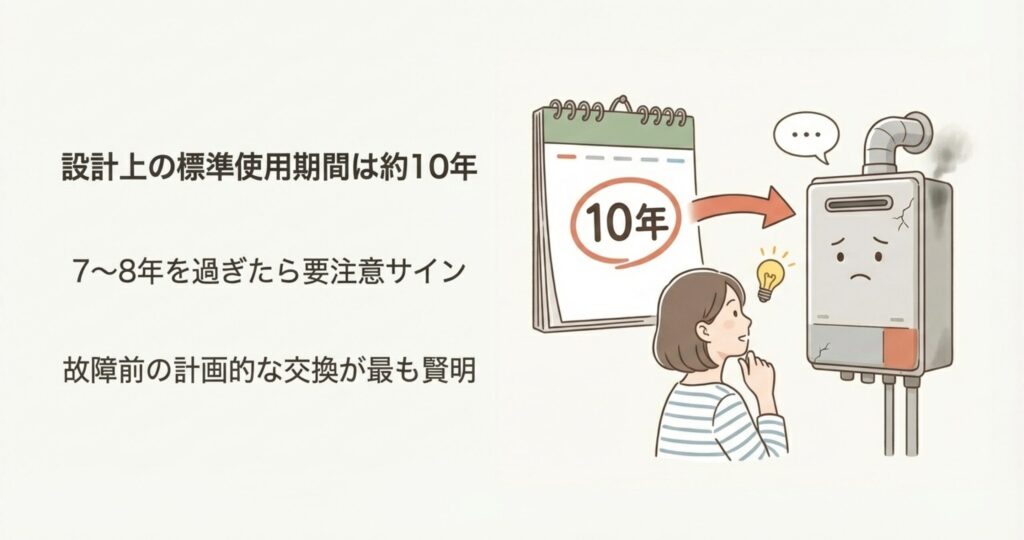 (出典:リンナイ『ガス給湯器・ガスふろ給湯器の設計上の標準使用期間 10年』)