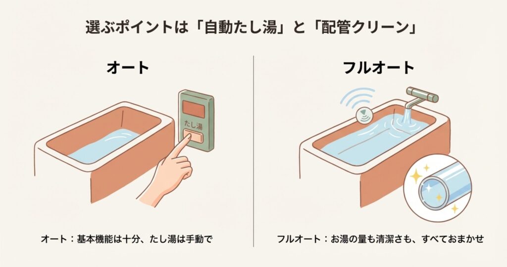 簡単に言うと、「足し湯まで全自動でやってくれるかどうか」の差です。