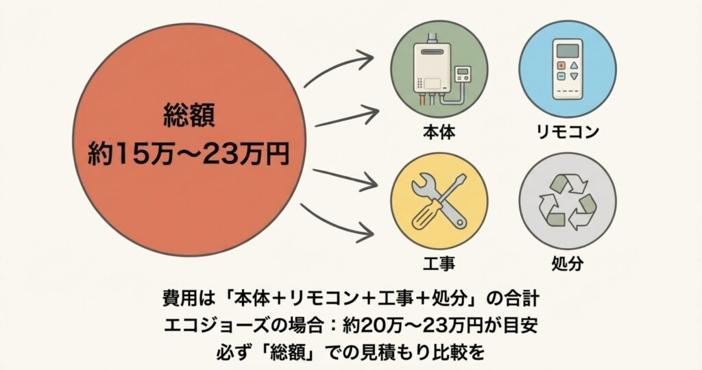 これが省エネタイプのエコジョーズになると、本体代が少し上がって20万〜23万円くらいになるイメージですね。