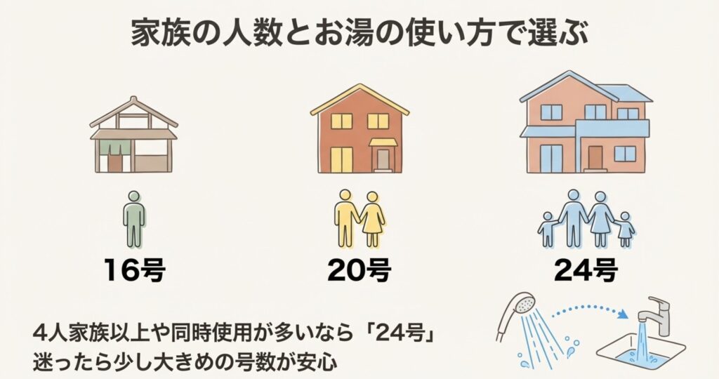 一般的には16号、20号、24号の3種類。号数が大きくなるほど、一度にたくさんのお湯を作れるので、値段も少しずつ上がります。