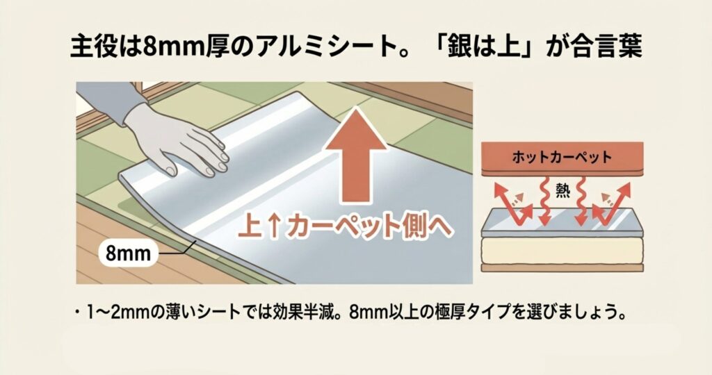 そして、これテストに出るくらい大事なことなんですが(笑)、銀色の面は必ず「上(カーペット側)」に向けてくださいね。銀面は熱を反射する役割を持っているので、上に向けないとせっかくの熱が畳に吸い取られてしまいます。