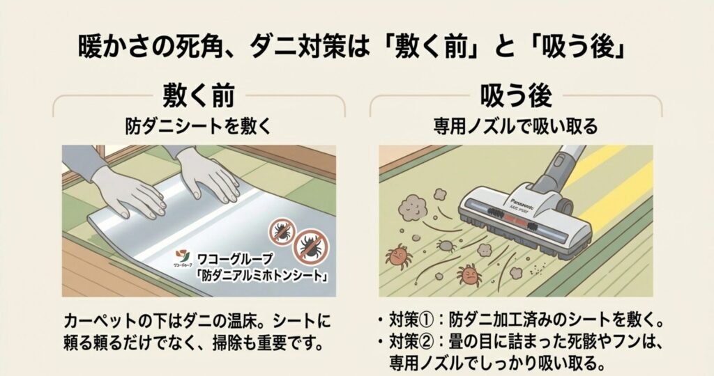 冬場でも、ホットカーペットの上はポカポカ。これ、実はダニにとっても最高の環境なんです。