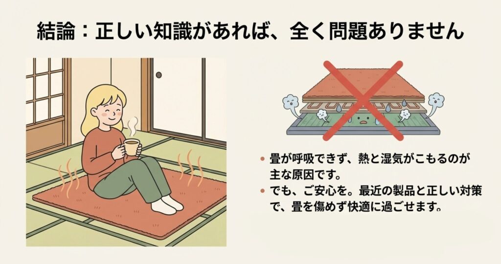 でも、いざ敷こうと思うと「畳がカビたらどうしよう」「火事の原因にならないかな」なんて不安が頭をよぎりませんか?