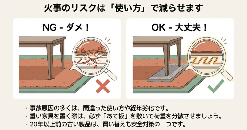 脚の細いテーブルなどを置くと、内部のヒーター線が圧迫されて断線し、そこから異常発熱するリスクがあるんですよ。