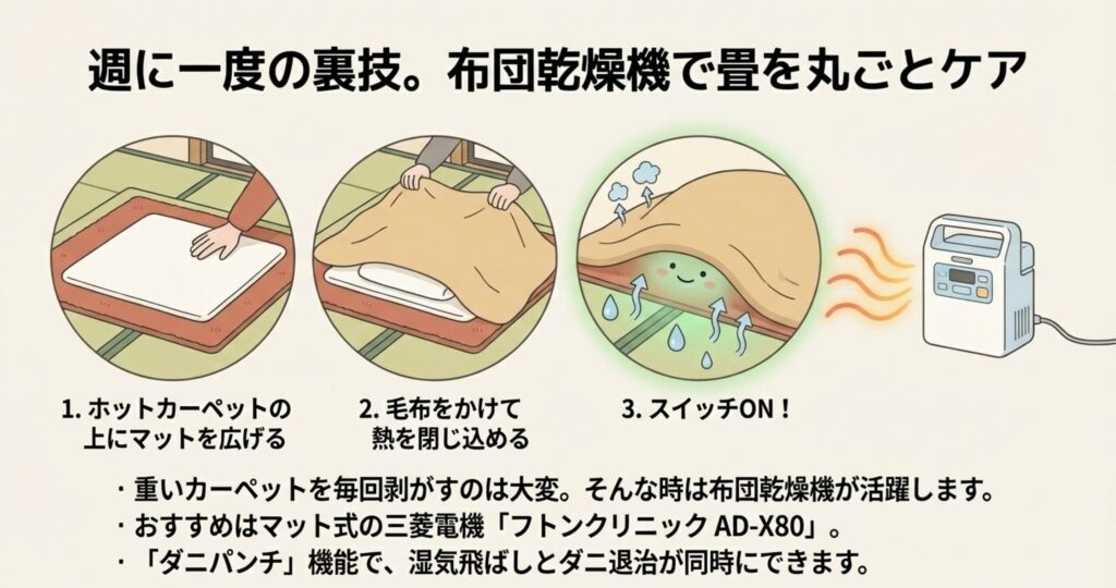 ホットカーペットを剥がしてお手入れするのは重労働ですよね。そんな時に大活躍するのが、実は布団乾燥機なんです。
